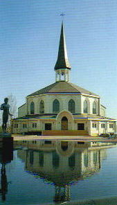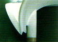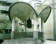 | 球と球を組み合わせて作った、この複雑なデザイン。建設会社の現場監督や型枠大工さんも首をひねるばかり。いつものように、完全な施工図が描きおこせないのです。施工図の寸法がわからなければ、型枠はもちろん建物はつくれません。縮小サイズの模型だけが、唯一の手がかりでした。異例の工場仮組み(こうじょうかりぐみ 注1 )を行ったり、CADを駆使したり、試行錯誤の末にようやく設計に忠実な型枠が完成。その後、見事な出来映えの鐘楼が竣工しました。日建定木の代表作のひとつです。 | 完成部分 |