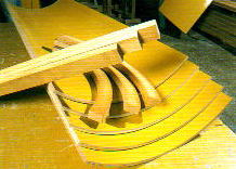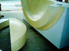 ゴムの型枠も、あります。鉄筋コンクリートの建物で、壁紙にレリーフ模様を入れたり、文字を浮き彫りにしたものを見かけたことはないでしょうか。これを作るための型枠が、ゴム製の型枠です。その他、金属製・発砲スチロール製の型枠などもあり、木製型枠では加工できない部分をカバーしています。 | |||||